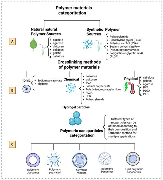 (A) Classification of polymer materials; (B) Crosslinking processes of polymer materials; (C) Common nanoformulations bases on polymer materials applied in medicine.