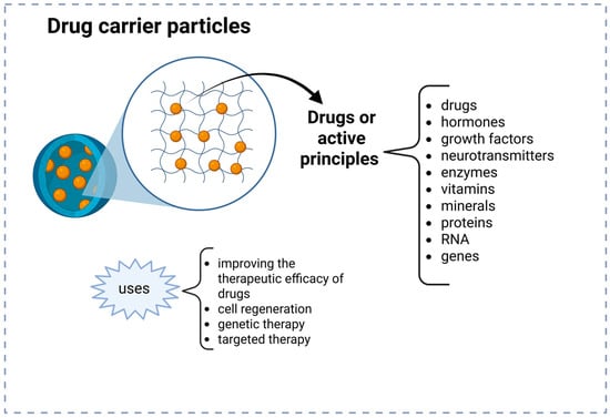 Figure 2 delineates the biomedical applications of polymeric nanoparticles classified into two categories. Particles encapsulated with drugs and living cells. Figure 2 depicts an image in which the hydrogel particle, referred to as a carrier or vehicle in medicine, encapsulates medications or active principles. The literature indicates that many substances, including hormones, growth factors, enzymes, vitamins, proteins, and RNA, have been encapsulated into a polymeric nanoparticle for the treatment of diseases such as cancer, diabetes, and cardiovascular ailments. These particles present a promising approach for targeted drug delivery, enhancing the therapeutic efficacy of pharmaceuticals, cellular regeneration, gene therapy, targeted therapy, and personalized medicine. To further enhance hydrogel functionality, active molecules such as pharmaceuticals, hormones, growth factors, enzymes, vitamins, therapeutic proteins, and nucleic acids (RNA/DNA) are routinely integrated within these polymer matrices. These encapsulated bioactive molecules allow hydrogels to serve multiple therapeutic purposes, ranging from controlled drug delivery to regenerative medicine applications [1,12,19,20,35].