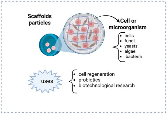 Particles of live cell-encapsulated in hydrogel, depicted in Figure 3, are predominantly utilized as scaffolds in in situ-forming research. Potential for regenerative medicine has been demonstrated, particularly in tissue, cartilage, and bone engineering applications, by creating a microenvironment that supports cell development and function. Another application is in biotechnological engineering, cultivating microorganisms capable of generating beneficial metabolites. Additionally, probiotic bacteria have been encapsulated for enhancement in promoting gut health and supporting the immune system.