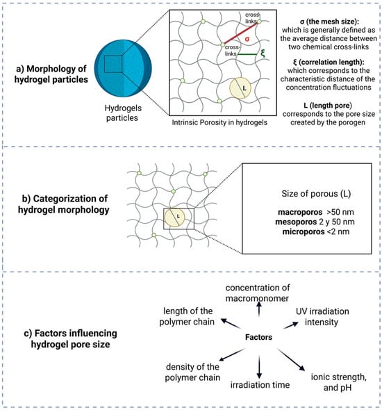 (a) Morphology of hydrogel particles. (b) Categorization of hydrogel morphology according to pore size. (c) Factors influencing hydrogel pore size.