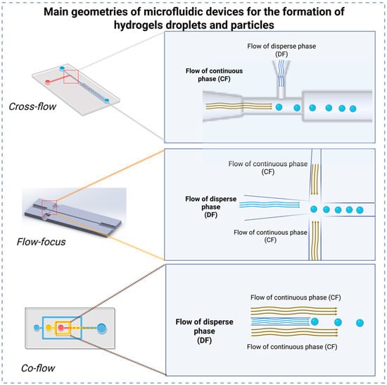 Main geometries of microfluidic devices for the formation of hydrogels. The left side illustrates the diapositives used for each geometry, where different colors can be continuous or flow phases. On the right side, the flow and formation of droplets (blue circles) is depicted.