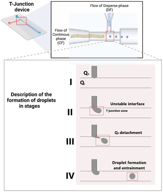 Figure 8 illustrates the development of a droplet within a microfluidic device. In the DF channel, the entrance of the dispersion phase is located, while the CF channel facilitates the flow of the continuous phase, which shears and transports the dispersed phase droplets toward the exit channel. Zone I illustrates the entry point of the DF fluid, while Zone II is designated as Zone T based on the channel shape. The droplet creation is visible in this zone. In Zone III, the droplet separates due to the pull exerted by the CF fluid, and ultimately, in Zone IV, the droplet traverses the output channel without intermingling the two fluids. Fluids with polymer precursors or hydrogel substances are put into the microfluidic device during this step [60].