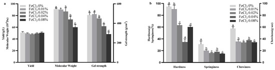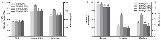 Effect of FeSO4 concentration on curdlan yield, gel strength, and molecular weight (Mw) (a), and Texture Profile Analysis (TPA) of curdlan gel (b). Different lowercase letters denote significant difference (p < 0.05).