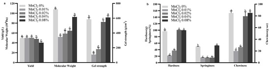 Effect of MnCl2 concentration on curdlan yield, gel strength, and molecular weight (Mw) (a), and Texture Profile Analysis (TPA) of curdlan gel (b). Different lowercase letters denote significant difference (p < 0.05).