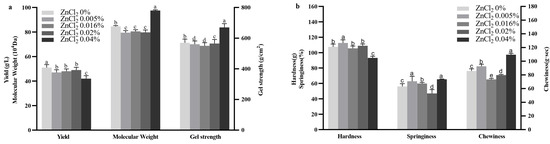 Effect of ZnCl2 concentration on curdlan yield, gel strength, and molecular weight (Mw) (a), and Texture Profile Analysis (TPA) of curdlan gel (b). Different lowercase letters denote significant difference (p < 0.05).