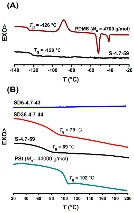 The DSC traces in the ranges of the glass transitions of PDMS (A) and PSt (B) for the PDMS and PSt homopolymers, and the PSt-l-PDMS and PSt-l-PDMS/DVB conetworks.