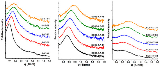 SAXS measurements were performed on the CREDO instrument [125] equipped with a GeniX3D Cu ULD beam delivery system with integrated FOX 3D parabolic multilayer optics (Xenocs SA, Sassenage, France) and a 30 W microfocus Cu anode X-ray tube (Xenocs SA, Sassenage, France). The produced X-ray beam (λ = 0.154 nm) was cut to the required cross-section and divergence using a 3-pinhole collimation scheme [126]. After interacting with the samples mounted on a ladder sample holder inside the evacuated sample chamber, scattered X-rays were detected with a Pilatus 300K CMOS hybrid pixel detector (Dectris Ltd., Baden, Switzerland). From each sample, several scattering patterns were recorded to assess the stability of the sample and the instrument. The sample-to-detector distances were nearly the same for each sample, covering the range of 0.05 < q < 2 nm−1, where the q is the magnitude of the scattering vector, defined as q = 4π sin θ/λ, where 2θ is the scattering angle and λ = 0.154 nm is the X-ray wavelength of the Cu Kα radiation used. The individual scattering patterns were subjected to the standard correction procedure of the instrument as soon as they were ready. Geometric effects, such as detector flatness, X-ray absorption in the sample, etc., were accounted for. The angular range was calibrated (through determining the sample-to-detector distance) using a mixture of silver behenate and a batch of SBA15 mesoporous silica which was previously calibrated in the same instrument on first principles basis. Although the intensity is routinely calibrated into absolute units of differential scattering cross-section using a piece of glassy carbon, due to the uncertainty of determining the sample thickness, in this case, we were only able to express the intensity on a relative scale of arbitrary units.