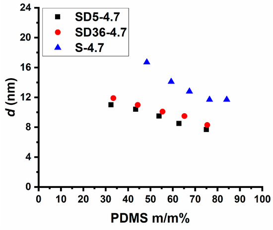 As shown in Figure 3, the SAXS curves consistently exhibit a single peak, indicative of disordered phase separation within the samples. Notably, the maxima of these curves are shifted towards larger values of the scattering vector (q) with increasing PDMS content. Deeper data analysis revealed that the d-spacing (average domain spacing), defined as d = 2π/qmax, is composition-dependent. For the PSt-l-PDMS conetworks, it ranges from 11.7 to 16.7 nm. In contrast, the d-spacing values change from 8.3 to 11.9 nm and from 7.9 to 11.2 nm for conetworks with 36:1 and 5:1 St/DVB weight ratios, respectively, as presented in Table 2 and Figure 4. As shown in Figure 3, the shape of the scattering curves becomes broader with increasing the DVB content. This indicates broader distribution of domain distances in the DVB containing conetworks, on the one hand. On the other hand, the d-spacing is almost the same for both conetworks containing DVB, while it is higher for the PSt-l-PDMS conetworks by ~3–6 nm than that for the PSt-l-PDMS/DVB samples. These findings clearly indicate that both the PSt-l-PDMS and PSt-l-PDMS/DVB conetworks possess nanophase separated morphology with d-spacing in the 8–17 nm range, which is consistent with the transparency of all these conetworks, i.e., these conetworks are composed of separate PSt and PDMS nanodomains. The absence of higher order peaks in the SAXS curves indicates the absence of detectable long-range ordering, that is, it can be concluded that all the investigated conetworks possess disordered nanophasic morphology.
