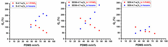 The swelling behavior of crosslinked polymers is a critical property which provides insights into their structural characteristics as well. In order to reveal whether a solvent which is only solvent for one of the components in the PSt-l-PDMS and PSt-l-PDMS/DVB conetworks is able to swell preferentially the given component, detailed swelling experiments were carried out with 1-nitropropane (1-PrNO2) and n-hexane. Among these, 1-PrNO2 is a good solvent for PSt but is a non-solvent for PDMS, as found during preliminary solubility tests, while hexane is a good solvent for PDMS, but PSt is insoluble in this solvent. As shown in Figures S1 and S2, the swelling degrees were measured as a function of time until equilibrium swelling was achieved for all the samples (with the exception of sample SD5-4.7-75, which disintegrated after a relatively short time when swelling in hexane). As presented in these Figures, both solvents are able to swell the conetworks, and the initial rates of swelling and the equilibrium swelling degrees (Qe) depend on the composition. The Qe values obtained in both 1-PrNO2 and n-hexane are displayed in Figure 6 and Figure S3 as a function of PDMS content. The data in these Figures clearly indicate that swelling capacity, i.e., Qe decreases in 1-PrNO2, while it increases in n-hexane with increasing PDMS content. It can also be seen in Figure S3 that the presence of DVB decreases the equilibrium swelling degrees for a given composition in 1-PrNO2 only in the case of conetworks with 5:1 St/DVB (m/m) ratio, indicating that the PDMS content is the determining factor of Qe even at relatively high, that is, at 36:1 St/DVB (m/m) ratio. In contrast, the Qe in hexane decreases with increasing DVB content in the conetworks (Figure S3). The relatively high Qe values even at relatively low and high PDMS contents in both solvents confirm the bicontinuous phase separation in these conetworks indicating that the non-swelling phase does not restrict the solvent diffusion in the continuous other phase. As also displayed in Figure 6 and Figure S3, the selective swelling behavior in terms of Qe of the PSt-l-PDMS and PSt-l-PDMS/DVB double-hydrophobic conetwork gels enable preliminary design of such materials with predetermined swelling capacity in the investigated solvents in a wide range of ~20–300% equilibrium swelling degree.