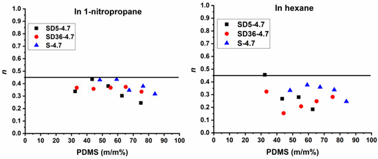 affords the determination of the diffusion exponent. As shown in Figure S4, the log(Qt) versus log(t) plots provide a linear relationship for the swelling in both 1-PrNO2 and hexane for all the conetwork samples. The slopes of the straight lines give the diffusion exponent (n) values, which are displayed as a function of PDMS contents of the conetworks in Figure 7. In this Figure a line at n = 0.45 value indicates Fickian diffusion of the solvent molecules. However, the diffusion exponents range from 0.25 to 0.44 in 1-PrNO2 and from 0.15 to 0.46 in hexane, with one exception in the latter case. These results indicate that the diffusion of both solvents during the swelling of either the PSt-l-PDMS or PSt-l-PDMS/DVB conetworks follows a hindered Fickian diffusion mechanism [116]. This suggests that while solvent diffusion is governed by Fick’s laws, it is restricted by the structural characteristics of the conetworks.