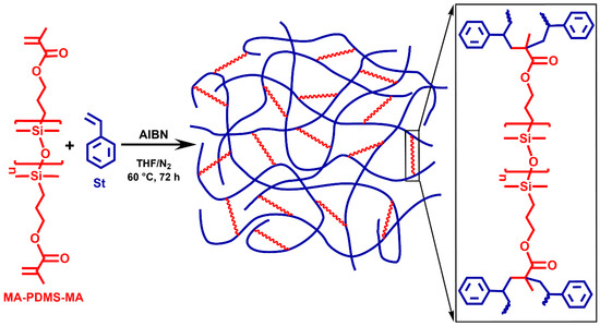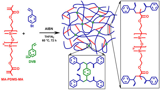 Styrene (St, 99%, Sigma-Aldrich, Steinheim, Germany) and divinylbenzene (DVB, 80% technical grade, consisting of 80% m/p-divinylbenzene and 20% ethylstyrene determined by 1H NMR, from Honeywell Fluka, Steinheim, Germany) were freshly distilled from calcium hydride under reduced pressure prior to use. Methacryloxypropyl-telechelic poly(dimethylsiloxane) (MA-PDMS-MA, Gelest Inc., Morrisville, PA, USA) was purified by precipitation of its hexane solution (20 m/m%) into methanol, then decanted and extracted with distilled water in a separatory funnel. The hexane fraction was dried on anhydrous magnesium sulfate, and after the filtration of the desiccant, hexane was evaporated by a rotary evaporator followed by drying the MA-PDMS-MA by vacuum at room temperature. This process led to the removal of the inhibitor from the commercial product as shown by comparing the 1H NMR spectra of the unpurified and purified polymer in Figures S5 and S6, respectively. The number average molecular weight (Mn) of the purified MA-PDMS-MA was determined by 1H NMR (Mn = 4700 g/mol). α,α′-Azobisisobutyronitrile (AIBN, Sigma Aldrich, Steinheim, Germany) was recrystallized from methanol twice and dried under vacuum at room temperature prior to use. Tetrahydrofuran (THF, VWR International Ltd., Debrecen, Hungary) was refluxed over and distilled from sodium–benzophenone before use. Other chemicals, 1-nitropropane (1-PrNO2, Sigma Aldrich, Steinheim, Germany), n-hexane (Molar Chemicals, Halásztelek, Hungary), and methanol (MeOH, VWR International Ltd., Debrecen, Hungary) were used as received without further purification.