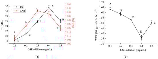 Effects of GSE addition on properties of PE/GSE−gelatin/chitosan composite edible gel films ((a) Mechanical properties (tensile strength (TS) and elongation at break (EAB)), (b) Water Vapor Permeability (WVP)). (The different letters A–D marked in the figure (a) indicated significant differences in the results of TS (p < 0.05); The different letters a–c marked in the figure (a) indicated significant difference in EAB (p < 0.05); The different letters A–D marked in the figure (b) indicated significant differences in the results of WVP (p < 0.05).).