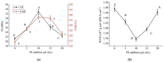 Effects of PE addition on properties of PE/GSE−gelatin/chitosan composite edible gel films ((a) mechanical properties (tensile strength (TS) and elongation at break (EAB)), (b) Water Vapor Permeability (WVP)). (The different letters A–D marked in the figure (a) indicated significant differences in the results of TS (p < 0.05); The different letters a–d marked in the figure (a) indicated significant difference in EAB (p < 0.05); The different letters A–D marked in the figure (b) indicated significant differences in the results of WVP (p < 0.05).).