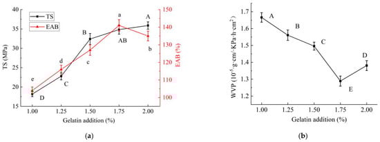 Effects of gelatin addition on properties of PE/GSE−gelatin/chitosan composite edible gel films ((a) mechanical properties (tensile strength (TS) and elongation at break (EAB)), (b) Water Vapor Permeability (WVP)). (The different letters A–D marked in the figure (a) indicated significant differences in the results of TS (p < 0.05); The different letters a–e marked in the figure (a) indicated significant difference in EAB (p < 0.05); The different letters A–E marked in the figure (b) indicated significant differences in the results of WVP (p < 0.05).).