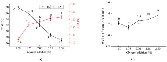 Effects of glycerol addition on properties of PE/GSE−gelatin/chitosan composite edible gel films ((a) mechanical properties (tensile strength (TS) and elongation at break (EAB)), (b) Water Vapor Permeability (WVP)). (The different letters A–E marked in the figure (a) indicated significant differences in the results of TS (p < 0.05); The different letters a–d marked in the figure (a) indicated significant difference in EAB (p < 0.05); The different letters A–C marked in the figure (b) indicated significant differences in the results of WVP (p < 0.05).).