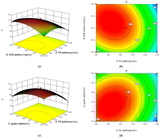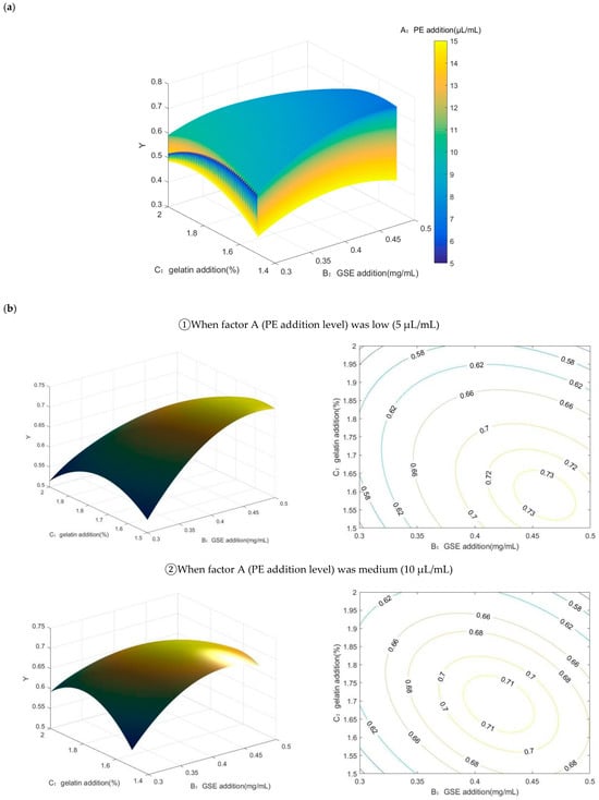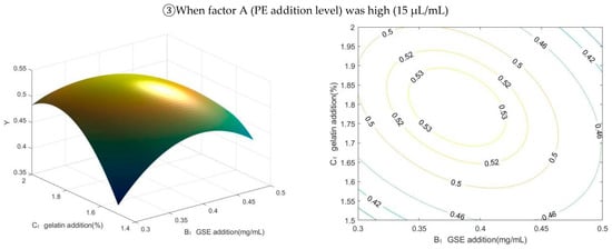 Since the previous results showed that factor A (PE addition) had the most significant effect on the gel films, in order to better describe the interactive effects among the analysis data, we plotted the interactive effects of gelatin addition and GSE addition amounts on Y in 4D, when factor A (PE addition level) was low (5 μL/mL), medium (10 μL/mL), and high (15 μL/mL), respectively. The three dimensions of rotary surface and contour projection were plotted as shown in Figure 6.