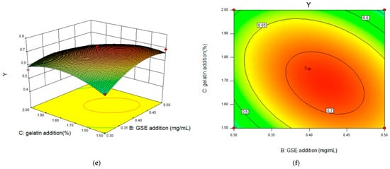 When the addition of PE, (A) was set at a low value (A = 5 μL/mL), the supplemental level of GSE (B) was fixed, and with the increase in the supplemental level of gelatin (C), the Y value showed a slight increase at first, and then a significant trend of continuous decline. The value of Y ranged from 0.5147 to 0.7341. When B was 0.43–0.48 mg/mL and C was 1.5–1.65%, Y could approach a larger value.