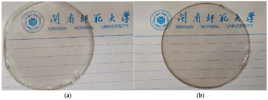 The test of WVP was made with reference to Xue et al. []. The gel films were sealed with a glass bottle containing the appropriate amount of deionized water. Then, the samples were placed at room temperature for 24 h before weighing. The WVP of the gel films was calculated according to Equation (4).