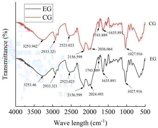 The FTIR analysis of the gel films of the experimental group (EG, PE/GSE–gelatin/chitosan composite edible gel films with 10 μL/mL of PE added) is shown in Figure 8. The GSE–gelatin/chitosan composite edible gel films without PE added were taken as the control group (CG) to observe the effect of the PE addition on the gel film’s structure. According to the analysis of infrared spectra, the spectra of the above two films were highly similar, and the characteristic peaks were mainly in the range of 3180~3375 cm−1 (amido-A band, N-H stretching vibration, and O-H stretching vibration), 2900 cm−1 (asymmetric stretching vibration of CH2 and CH3), 1650–1600 cm−1 (amylamine I band, C=O stretching vibration), 1550–1500 cm−1 (amylamine II band, N-H bending vibration), and 1240 cm−1 (stretching vibration of amide III band, C-N bond) []. Among them, the absorption peaks of the composite films supplemented with PE mainly increased or decreased at 1635–1743 cm−1, which may be due to the C=O stretching vibration changes in aldehydes or lipid carbonyl groups in PE []. At the same time, the very small absorption peaks between 1600–1500 cm−1, 1450–1400 cm−1, and 1300–1200 cm−1 were also changed, which may be due to the fact that certain components of the essential oil (such as limonene, β-clove hydrocarbon, etc.) may be enhanced or weakened in a certain wavenumber range.