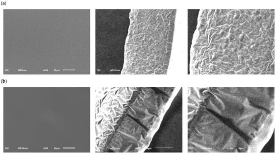 Microstructure of the composite edible gel films (a) surface images (magnification: 900× g), cross-sectional images (magnification: 500× g), and cross-sectional images (magnification: 1000× g) of CG; (b) surface images (magnification: 900× g), cross-sectional images (magnification: 500× g), and cross-sectional images (magnification: 1000× g) of EG, respectively.