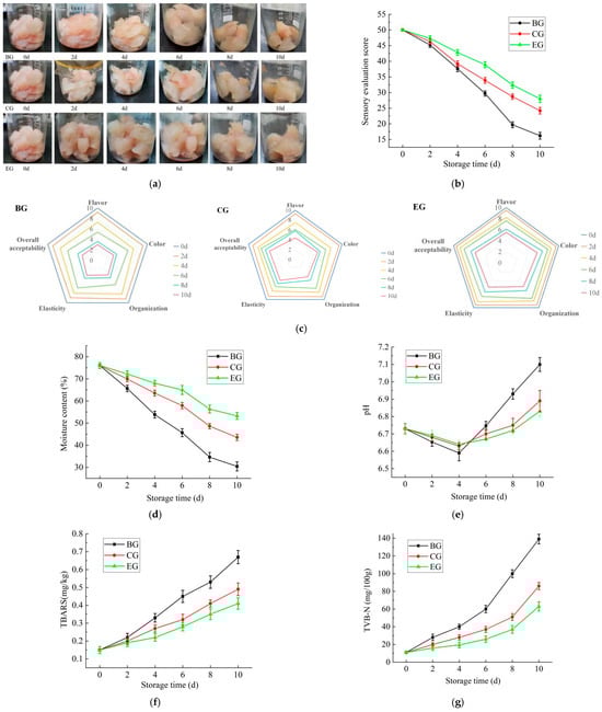 Effects of gel films on the physicochemical properties of grass carp during storage. (a) Effect of gel films on the shape of fish during storage. (b) Effect of gel films on the sensory evaluation score. (c) Radar map of sensory changes in fish during storage. (d) Effect of gel films on moisture content. (e) Effect of gel films on pH; (f) Effect of gel films on TBARS. (g) Effect of gel films on TVB-N; EG: the PE/GSE–gelatin/chitosan composite edible gel films with PE added at 10 μL/mL were used in the experimental group; CG: the GSE–gelatin/chitosan composite edible gel films without PE added were taken as the control group; BG: no preservation measures were used in the blank group (BG).