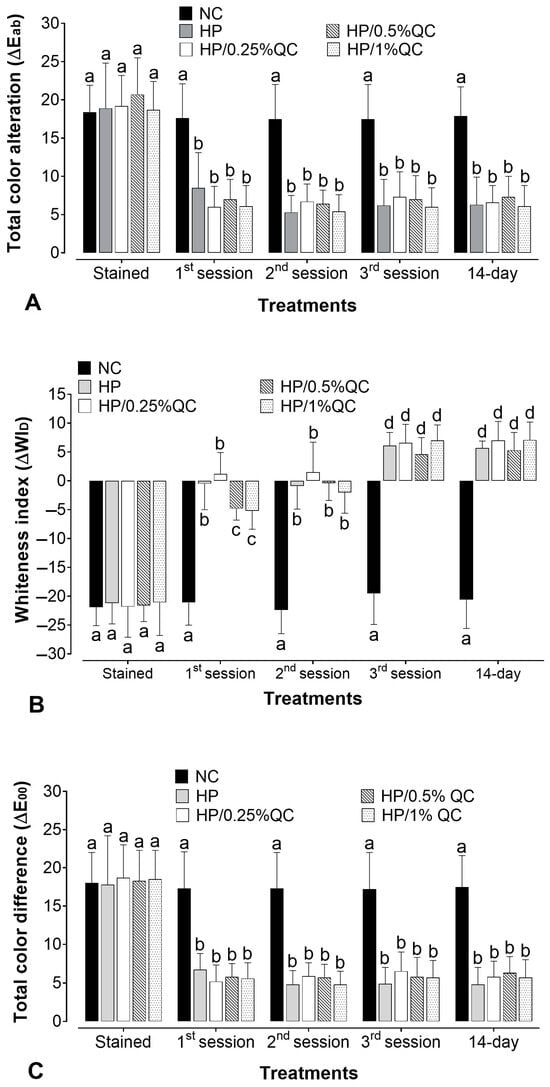 The bleaching gels promoted a significant color change (ΔEab) after the treatment sessions (p < 0.05), except for the negative control group, which showed no significant color change at any of the times evaluated (p > 0.05). For H2O2-containing agents, the whitening effect was more evident after the first session, with a steady progression in subsequent sessions (Figure 1A). When comparing the different bleaching gels, there was no statistically significant difference in whitening efficacy (ΔEab) between them (p > 0.05). Furthermore, with respect to the Whiteness Index for Dentistry (ΔWID), the H2O2-based groups showed gradual and continuous chromatic improvements throughout the treatment sessions, resulting in visibly whiter samples. Additionally, no significant differences were observed among the groups, even with the varying concentrations of quercetin (p > 0.05) (Figure 1B). For ΔE00, all H2O2-based treatments promoted clinically perceptible color changes (ΔE00 > 0.8), with similar whitening effectiveness across all time points (p > 0.05) (Figure 1C). Across all parameters analyzed (ΔEab, ΔWID, and ΔE00), the bleaching agents sustained a stable effect up to 14 days after treatment completion (p > 0.05).
