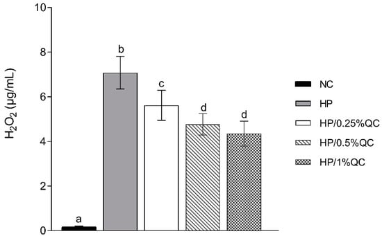 Quercetin is a bioactive molecule widely recognized for its role in promoting various biological processes [18]. The findings of this study corroborate previous research demonstrating quercetin’s potential to enhance the mechanical properties of dental tissues [22,42,45]. Its application has proven effective in remineralizing enamel caries lesions and improving enamel surface topography [41]. In dentin, quercetin stabilizes the collagen matrix, acting as a barrier that prevents acid penetration, thereby inhibiting demineralization [40]. Furthermore, its antioxidant properties suggest a reduction in the diffusion of H2O2 into pulp tissue and in the penetration of H+ ions generated by H2O2 dissociation, offering enhanced protection to dental structures during bleaching. This supports the findings of the present study. Additionally, quercetin effectively suppresses free radicals by inhibiting the formation of superoxide ions, hydroxyl radicals in the Fenton reaction, and lipid peroxide radicals [46]. Its antioxidant capacity is further enhanced by its ability to react with these radicals and form iron complexes, which block the catalysis of reactive oxygen species [18]. Due to its non-toxic nature and its ability to inhibit free radical processes at various stages, quercetin is considered a highly potent natural antioxidant [18,46].