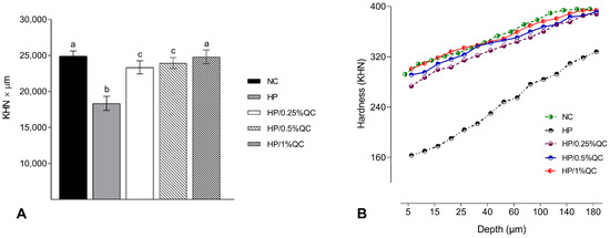 Cross-sectional hardness analysis. (A) Mean values (SD) of cross-sectional hardness (KHN × µm). Distinct superscript lowercase letters indicate statistical differences among experimental groups (Student–Newman–Keuls test, p < 0.001). (B) Cross-sectional hardness profiles at different depths in the enamel (n = 12) according to the experimental groups.