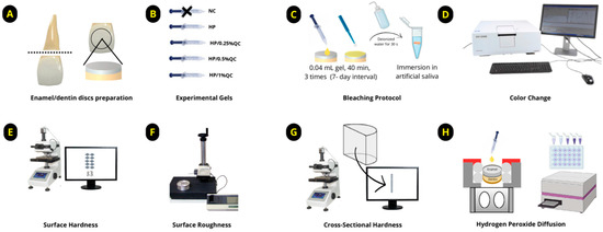 Diagram illustrating the experimental design of the study. (A) Preparation of enamel/dentin discs. (B) Formulation of experimental gels. (C) Bleaching protocol. (D) Analysis of color change. (E) Measurement of surface hardness. (F) Measurement of surface roughness. (G) Cross-sectional hardness (KHN × μm). (H) Transamelodentinal diffusion of hydrogen peroxide analysis.