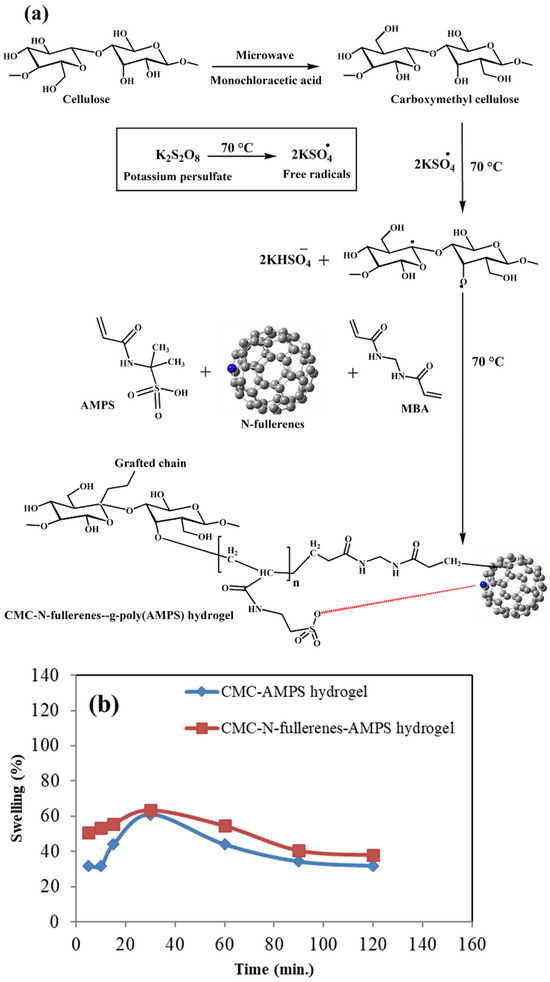 (a) Reaction mechanism for synthesizing carboxymethyl cellulose–N-fullerene–g-poly(co-acrylamido-2-methyl-1-propane sulfonic acid) hydrogel and (b) the swelling study of CMC–AMPS hydrogel and CMC–N-fullerene–AMPS hydrogel.