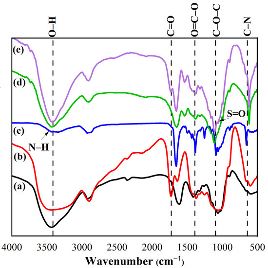 FTIR spectra of (a) cellulose, (b) CMC, (c) N-fullerenes, (d) CMC–AMPS hydrogel, and (e) CMC–N-fullerene–AMPS hydrogel.