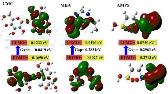 The gap energies (HOMO–LUMO) (eV) were calculated for the hydrogels using DFT B3LYP/6–31G (d), as was the molecular orbital interaction between CMC, MBA, AMPS, CMC–AMPS hydrogel, N-fullerenes, and CMC–N-fullerene–AMPS hydrogel.