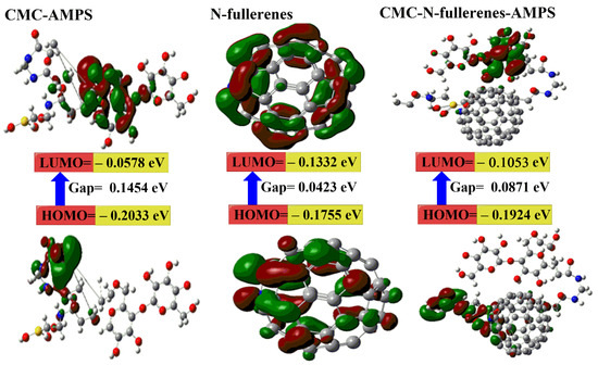 - The calculated Eg for the CMC–N-fullerene–AMPS hydrogel is the lowest (i.e., 0.0871 eV) compared to the CMC–AMPS hydrogel (i.e., 0.1454 eV), which in turn proves the strong chemical reaction between CMC, MBA, AMPS, and N-fullerenes in the CMC–N-fullerene–AMPS hydrogel compared to the CMC–AMPS hydrogel due to the presence of N-fullerenes [75,76].