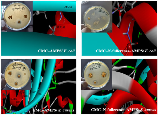 Our investigation demonstrated that the incorporation of N-fullerenes into the CMC–AMPS hydrogel significantly enhanced its antibacterial properties against both Gram-negative (Escherichia coli) and Gram-positive (Staphylococcus aureus) bacteria. While CMC–AMPS hydrogel exhibited no inhibition against E. coli, the CMC–N-fullerene–AMPS hydrogel displayed a substantial inhibition zone of 22 mm. Similarly, for S. aureus, the CMC–N-fullerene–AMPS hydrogel demonstrated a larger inhibition zone (24 mm) compared to CMC–AMPS hydrogel (15 mm). This enhanced antibacterial activity against Gram-positive bacteria is likely attributed to the presence of oxygen (O), nitrogen (N), and sulfur (S) functionalities within the CMC–N-fullerene–AMPS hydrogel (Figure 4) [77,78,79,80,81]. These functional groups are capable of interacting with key bacterial cell components, such as lipids, proteins, and DNA/RNA, through various mechanisms, including hydrogen bonding, π–π interactions, and electrostatic interactions [82,83]. Furthermore, the presence of N-fullerenes within the hydrogel may contribute to the observed antibacterial effect by regulating the generation of reactive oxygen species, potentially derived from bacterial surface proteins [84,85,86]. These findings were aligned with the docking results where the N–CDs showed binding with proteins with bond lengths of 0, 1.96, 2.80, and 2.07 A° for CMC–AMPS hydrogel/Escherichia coli, CMC–N-fullerene–AMPS hydrogel/Escherichia coli, CMC–AMPS hydrogel/Staphylococcus aureus, and CMC–N-fullerene–AMPS hydrogel/Staphylococcus aureus, respectively. Shorter bond lengths between the ligand and the protein result in a more reactive ligand. This increased reactivity enables the ligand to form a stronger bond (chelate) with the protein, potentially impairing its function and killing the microbe [15,16].
