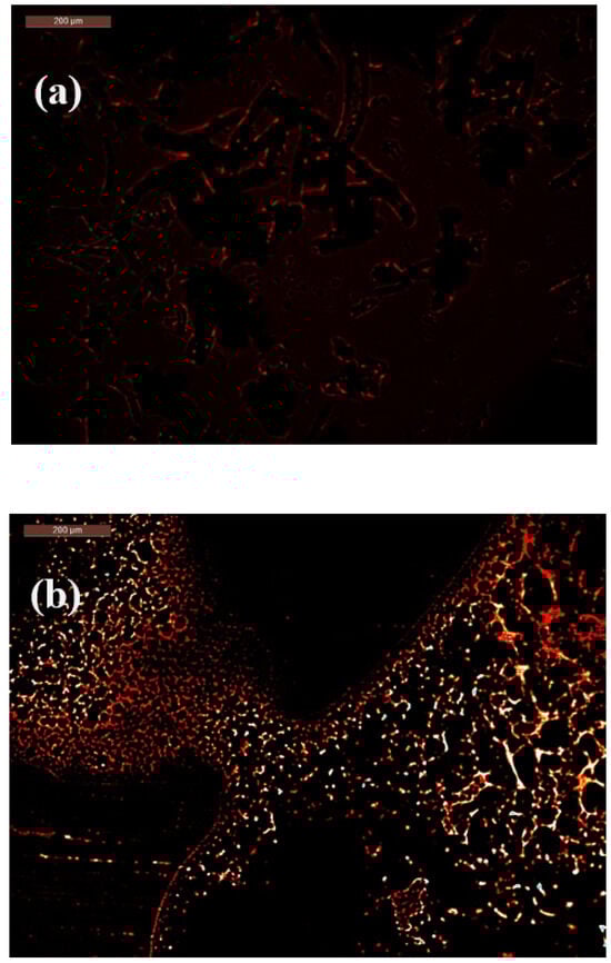 Initially, the CMC–N-fullerene–AMPS hydrogel appeared dark red. However, upon exposure to E. coli, a noticeable shift towards a brighter orange-red color was observed, accompanied by a broader color distribution. In contrast, interaction with S. aureus led to a more pronounced and uniform bright green coloration, demonstrating the “turn-on” fluorescence response of the hydrogel in the presence of both Gram-negative and Gram-positive bacteria (Figure 5).