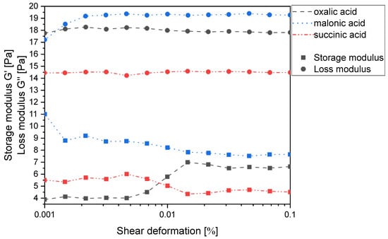 Chitosan can be easily dissolved in dilute acids, whereby the corresponding salts are formed by protonation of the amino group. According to our previous findings, the prerequisite for this and for avoiding depolymerization of the chitosan backbone is adding 0.95 to 0.99 equiv. (relative to the number of free amino groups) of a sufficiently strong and water-soluble carboxylic acid with a pKA < 5.0 []. In the homologous series of monocarboxylic acids, only the first four (formic to butyric acid) meet this requirement and solubilize chitosan. Building on this idea, the simplest way to produce chitosan gels without reactive cross-linkers, therefore, appeared to be the use of dicarboxylic acids. Not surprisingly, the homologous series of dicarboxylic acids (oxalic-, malonic- and succinic acid) easily solubilize chitosan in water when used in an equimolar ratio (1:2 ratio of free amino and carboxyl groups), since all three pKA1 values meet the above requirement. Under these conditions, the number of carboxylic acid groups is twice as high as that of the free amino groups, so the second interaction that could cause cross-linking of the chitosan chains can be either a hydrogen bond or dipole-charge interaction. However, all mixtures were clearly identified as viscous polymer solutions and not as gels, as the loss moduli exceeded the corresponding storage moduli in all cases (Figure 2). This was not surprising, as we have already shown that chitosan does not form a gel with itaconic acid, which is an α,β-unsaturated derivative of succinic acid, either [].