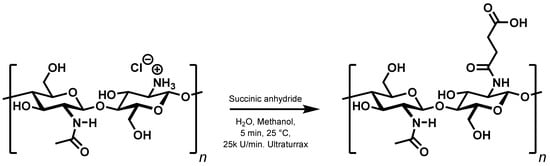 The results above seem to indicate that persistent, purely ionic gels cannot be prepared from chitosan and carboxylic acids. The next consequent step is to replace one ionic interaction with a covalent bond. There are two simple ways to accomplish this, either by reacting dicarboxylic acids with the free amino groups to form monoamides, or to alkylate the free amino groups using ω-halocarboxylic acids. As outlined in the introduction, the first method has previously been used to synthesise N-succinyl chitosan from chitosan hydrochloride and succinic anhydride [] (Figure 3).