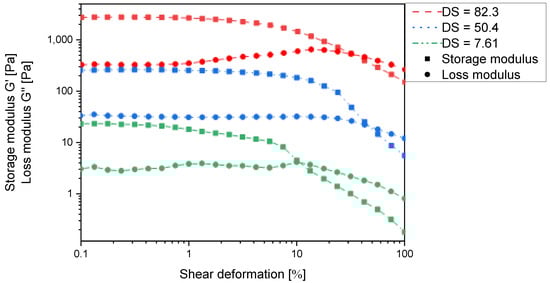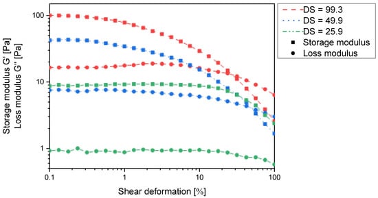 Storage modulus G′ and loss modulus G′′ of N-carboxymethylchitosan hydrogels (1 wt% in water) as a function of the shear deformation γ and the degree of N-substitution.