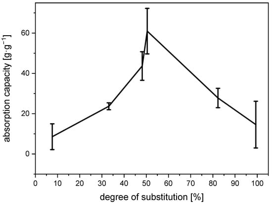 The water-absorption capacity of the N-succinyl chitosan gels initially rises to a peak of 61 g∙g−1 at a degree of substitution of approx. 50% and then drops to approx. 15 g∙g−1 at complete substitution (Figure 5). The initial increase in the absorption capacity is due to an increase in the number of charges and with it the number of CO2−⋯H3N+ interactions at higher degrees of substitution. Likewise, the subsequent drop in absorption capacity could be caused by a decreasing number of charge-charge interactions. Beyond 50% of substitution, every free amino group that is converted to the corresponding amide can no longer be protonated.