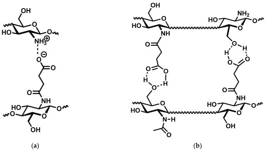 However, Figure 4 clearly indicates that the storage modulus continuously increases with increasing degree of substitution and is approx. one order of magnitude higher at 82% substitution than at 50% substitution. The latter can only be explained by an increase in cross-linking density, which would also lead to a reduced absorption capacity. It thus appears that in N-succinyl chitosan, there are two dominant cross-linking mechanisms operating: charge–charge interaction and hydrogen bonding (Figure 6). However, the present results do not allow to decide whether the latter are COOH⋯OH, COOH⋯HNCO, or a mixture of both.