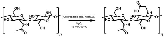 The second way of introducing a covalent bond, N-alkylation, has previously been used to synthesise N-carboxymethylchitosan from chitosan and 2-chloroacetic acid (Figure 7) []. Here, too, the extent of interactions between the chains was checked by investigating a set of derivatives with a degree of substitution ranging from 10% to 99% (Supplementary Table S2).