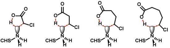 Both N-succinyl chitosan and N-carboxymethylchitosan are capable of forming charge–charge and charge–dipole interactions as well as hydrogen bonds. In addition, the pKA value of ω-substituted carboxylic acids increases with increasing number of methylene groups. That is, N-carboxymethylchitosan should be more acidic than N-succinyl chitosan and should, therefore, form stronger interactions, but the opposite is observed. The striking differences between the gel properties could, thus, originate in two structural differences: the additional amide bond in N-succinyl chitosan and the chain length. N-Malonylchitosan and N-oxalylchitosan are not available for analysing the effect of the chain length, since the required anhydrides are unknown. Instead, N-carboxyethylchitosan [] and N-carboxypropylchitosan were selected to complete a systematic set of N-carboxyalkyl derivatives with two to four carbon atoms and to obtain an alkylated equivalent of N-succinyl chitosan in order to compare their properties. The preparation of the higher N-carboxyalkyl derivatives follows the procedure described for N-carboxymethylchitosan. By increasing the amount of ω-halocarboxylic acid, higher degrees of substitution were obtained. However, the maximum degree of substitution decreased with increasing chain length of the acid from >99% for N-carboxymethylchitosan to 56.4% for N-carboxyethylchitosan and to 46.4% for N-carboxypropylchitosan even at an exorbitant excess of reagent. The next in line, N-carboxybutylchitosan, could not synthesised. At this point, it is important to remember that in order to solubilize chitosan, the free amino groups need to be protonated. Hence, the nitrogen lone pair is not available for nucleophilic substitution. It can be envisioned that the interaction of the carboxylate with the ammonium ion draws the halogenated chain end into proximity and in a concerted reaction the proton is transferred back to the carboxylate, releasing the lone pair, which simultaneously attacks the ω-carbon atom to close the C–C-bond (Figure 9). While the transition state for ω-chloroacetic, -propionic and -butyric acid adopts a 5-, 6-, or 7-membererd ring, which are energetically feasible, the 5-chloropentanoic acid—required for the preparation of N-carboxybutylchitosan—would need to go through an 8-membered ring, which is highly unfavourable. This is corroborated by two observations: (i) 4-chloropentanoic acid can be used to prepare the N-(1-methyl)carboxypropyl chitosan [], which would also proceed through a 7-membererd ring, and (ii) that interchain alkylation does not occur as the simultaneous COO−⋯H3N+ interaction is missing.