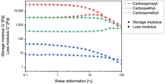 Due to the experimental constraints, the set of N-carboxyalkyl chitosans was compared using the derivatives with approx. 50% substitution. Here, the storage and loss moduli increase with increasing chain length in such a way that N-carboxyethyl and N-carboxypropyl chitosan form macroscopically stable gels (Figure 10). It thus appears that for one chitosan helix to interact with a second one via a non-covalent spacer, a certain distance and/or conformational flexibility is required. When comparing N-carboxypropylchitosan (46.4% substitution) with N-succinyl chitosan (48.15% substitution), it is noticeable that the former has a lower swelling capacity (38.4 g∙g−1 vs. 43.7 g∙g−1), but the storage modulus is approx. two orders of magnitude higher. This indicates that the N-carboxypropyl chitosan forms much stronger intermolecular interactions than the N-succinyl chitosan. As the only structural difference between these two compounds is the amide function, and this is a rigid structural element, the contribution of conformational flexibility to the intermolecular interaction must not be underestimated.
