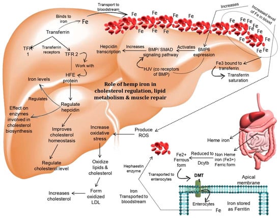 Hemp iron plays a role in muscle regeneration, lipid metabolism, and cholesterol management. Iron from hemp seeds that is coupled to transferrin and carried into the bloodstream raises BMP6 expression, which in turn triggers the BMP/SMAD signaling pathway, which ultimately triggers the transcription of hepcidin. Among the transferrin receptors, TFR1 and TFR2, which are coupled to iron, TFR2 regulates hepcidin by working with the HFE protein. This enhances cholesterol homeostasis, which further controls cholesterol levels and promotes the best possible muscle health and repair. At the same time, TFR 2 influences the enzymes involved in the manufacturing of cholesterol and controls the ideal amounts of iron (by author Avinash Kumar, 2025).