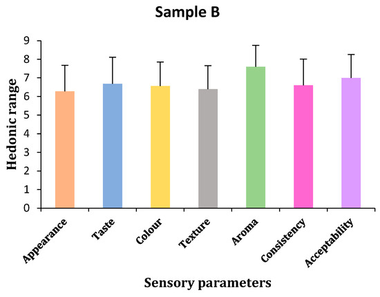 The sensory testing of the food product was carried out using the hedonic test in which we involved 25 panelists who were semi-trained. They evaluated appearance, color, consistency, aroma, taste, acceptability, and texture. The sensory characteristics were assessed by a 9-point scale (1 = dislike extremely and 9 = like extremely), then transferred into the increasing number scale [43,44,45,46,47,48]. All panelists were instructed to rinse their mouths with water in between each sample tasting during the evaluation.