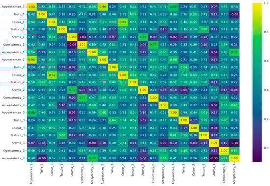 In sample 3, Acceptability_3 is moderately correlated with taste_3 (r = 0.60) and appearance_3 (r = 0.58), reinforcing the role of these attributes in overall acceptability. Consistency_3 has a weak or slightly negative correlation with acceptability_3 (r = −0.10), showing a minimal impact on the sample’s appeal (Figure 6).
