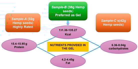 We developed a carbohydrate–protein gel in three variants (A, B, and C) containing different amounts of hemp seeds (32 g, 38 g, and 42 g, respectively). Sample A received the highest ratings across parameters, but sample B was preferred as a gel due to its favorable 1:2 carbohydrate-to-protein ratios, making it an excellent post-workout recovery supplement. The gel provides 131.36–135.27 kcal, 6.36–8.04 g of carbohydrates, 15.4–15.95 g of protein, and 4.2–4.45 g of fat per 50 g serving (Figure 7). It offers a convenient, natural source of macronutrients for athletes, requiring minimal preparation and being easy to carry.