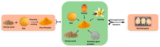 This study aimed to develop a carbohydrate–protein gel from hemp seeds (Cannabis sativa L.), Bengal gram dal (Cicer arietinum L.), and honey. This study targeted the development of a sports gel that utilizes hemp seeds (Cannabis sativa L.) in different proportions as raw materials, and this is formulated with hydrocolloid xanthan gum. This product can be helpful for athletes, serving as an optimal ratio of carbohydrates and protein that can optimize muscle glycogen re-synthesis after exercise (Figure 1). The resulting product was a gel based on hemp seeds, Bengal gram dal, and honey, which was analyzed for nutritional content and sensory characteristics.