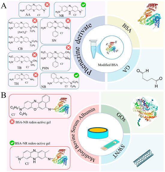 The following supporting information can be downloaded at https://www.mdpi.com/article/10.3390/gels11050355/s1, Figure S1: IR spectra; Figure S2: Raman spectra; Figure S3: SEM and EDX of the redox-active polymer: A. BSA-AA, B. BSA-CB, C. BSA-NR, D. BSA-NB, E. BSA-TH, F. BSA-TB, G. BSA-PHN; Figure S4: Electrochemical properties of polymers CV and heterogeneous constant rate calculation for: A. BSA-NB, B. BSA-NR, C. BSA-TH, D. BSA-CB, E. BSA-PHN, F. BSA-AA, G. BSA-SN, H. BSA-TB, I. BSA (Control), J. EIS of BSA (Control); Text S1: Heterogeneous electron transfer constant rate determination; Text S2: constant rate determination; Figure S5: Dependence (Id/Ik) on 1/ν1/2 for electrodes based on: A. BSA-NC; B. BSA-NR; C. BSA-TH; D. BSA-CB, E. BSA-SN, F. BSA-PHN,G. BSA-AA.; Figure S6: SEM and EDX of the BSA-NB-CNT composite; Figure S7: CV of composite for heterogeneous constant rate calculation A. BSA-NB-CNT; B. BSA-NR-CNT; Figure S8. CV of the BSA-NB-CNT composite for constant rate calculation; Figure S9. Dependence (Id/Ik) on 1/ν1/2 for electrodes based on: A. BSA-NB-CNT; B. BSA-NR-CNT; Figure S10. Electrochemical impedance spectra of BSA-NB-CNT composite and equivalent electrical circuit used for fitting the spectra. Table S1. Rate constants of interaction of mediators with enzymes. Figure S11. Effect of temperature on the response of a biosensor for the determination of A. Ethanol; B. Lactate; C. Starch. Figure S12. Effect of pH on the response of the biosensor for the determination of A. Ethanol; B. Lactate; C. Starch. Figure S13. Effect of NaCl concentration on the response of the biosensor for the determination of A. Ethanol; B. Lactate; C. Starch. Figure S14. Effect of phosphate buffer solution salt concentration on the response of the biosensor for the determination of A. Ethanol; B. Lactate; C. Starch. Figure S15. Effect of heavy metal ions on the response of the biosensor for the determination of A. Ethanol; B. Lactate; C. Starch.