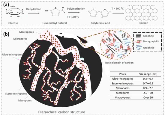 (a) Schematic representation of carbonization of organic components, using glucose as reference, and (b) illustration of hierarchical porous carbon, showing primary pore size (ultra- to macro-sized pores) with basic domains forms.